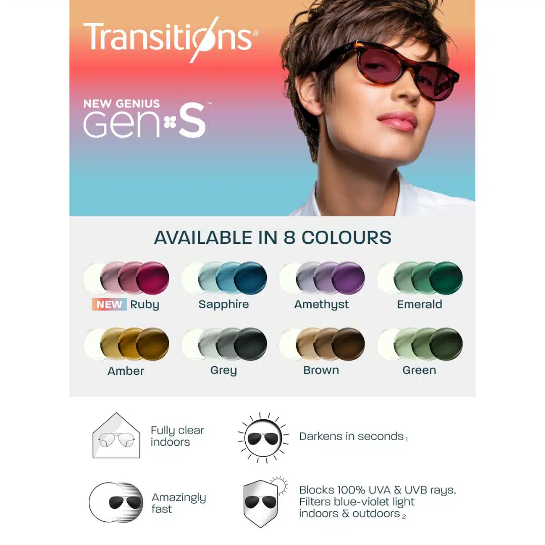 Transitions, also known as photochromic lenses, are a convenient solution for anyone who wears glasses and spends time indoors and outdoors. They are ultra-responsive to light, darkening when exposed to UV light, such as when you step outside, and returning to a clear state indoors, providing optimal vision at all times.